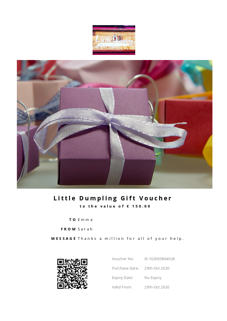 Little Dumpling allows you to purchase instantly printable gift vouchers, special offers and tickets using the Voucher Connect platform.